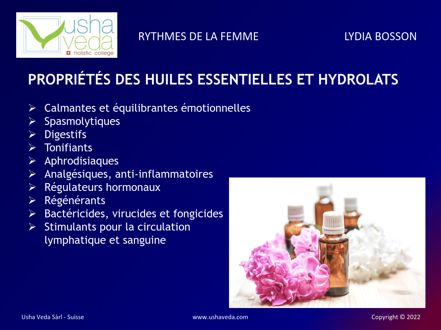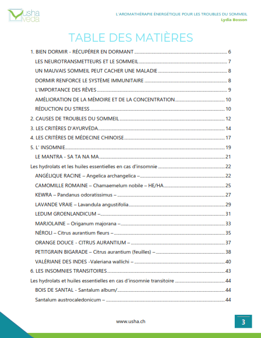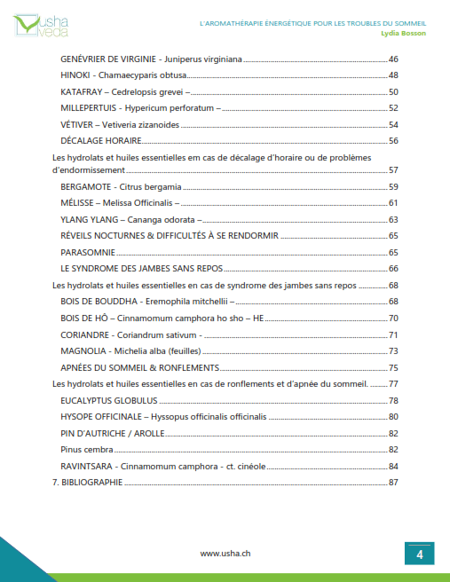 Angélique racine, Bergamote, Bois de Bouddha, Bois de Hô, Camomille romaine, Coriandre, Eucalyptus globulus, Genévrier de Virginie, Hinoki, Hysope officinale, Katafray, Kewra, Lavandre vraie, Ledum groenlandicum, Magniolia, Mandarine, Marjolaine, Mélisse, Millepertuis, Néroli, Orange, Petitgrain bigarade, Pin d’Autriche/Arolle, Ravintsara, Valériane des Indes,